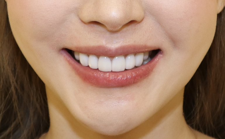 上前歯中央2本の歯並びと歯の形を改善し、2番目3番目との歯並びを整えました。そしてより華やかな印象の口元になるように4番目を少し目立たせるように並べて配置しました。
