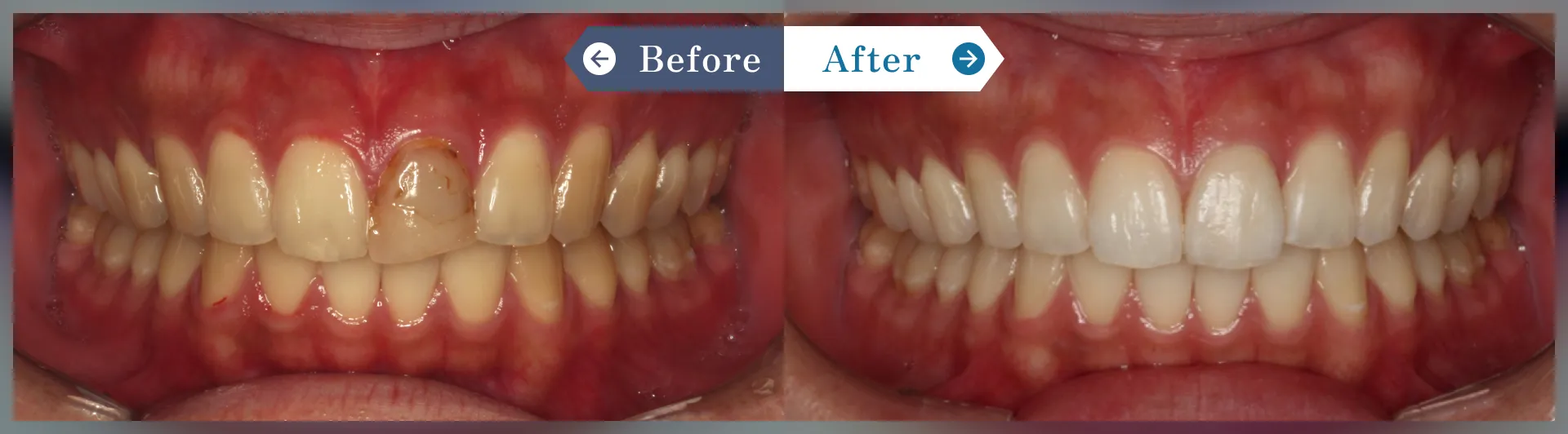左上1は失活歯(神経のない歯)で変色していました。全体的にホワイトニングしてから、左上1の変色歯をセラミッククラウン1本で改善しました。全体的に統一感と清潔感のある仕上りにしました。