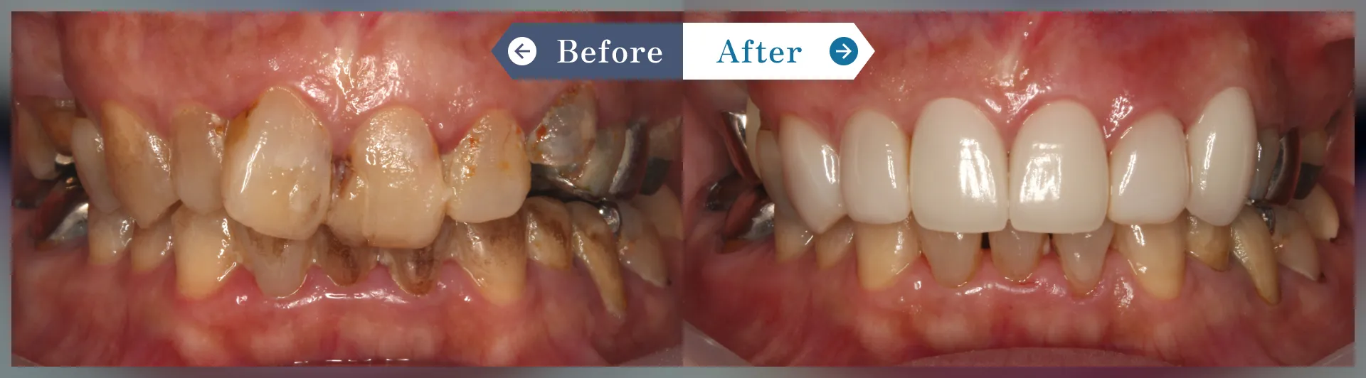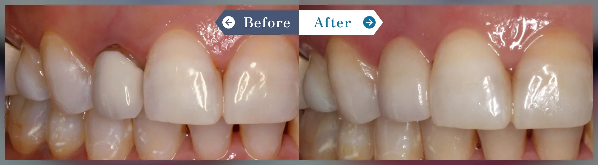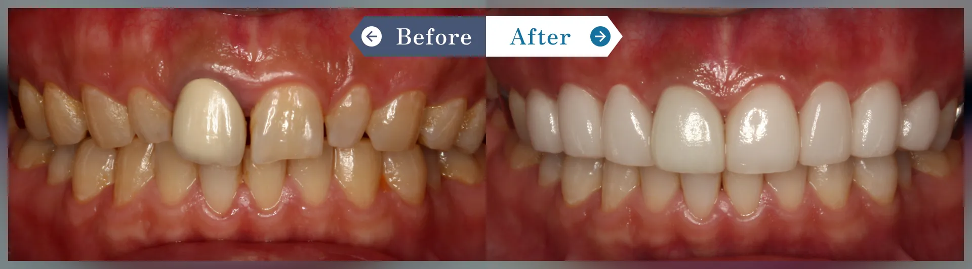 右上2の古いセラミッククラウンに対して、歯肉の処置とセラミッククラウン1本にて審美的に改善しました。