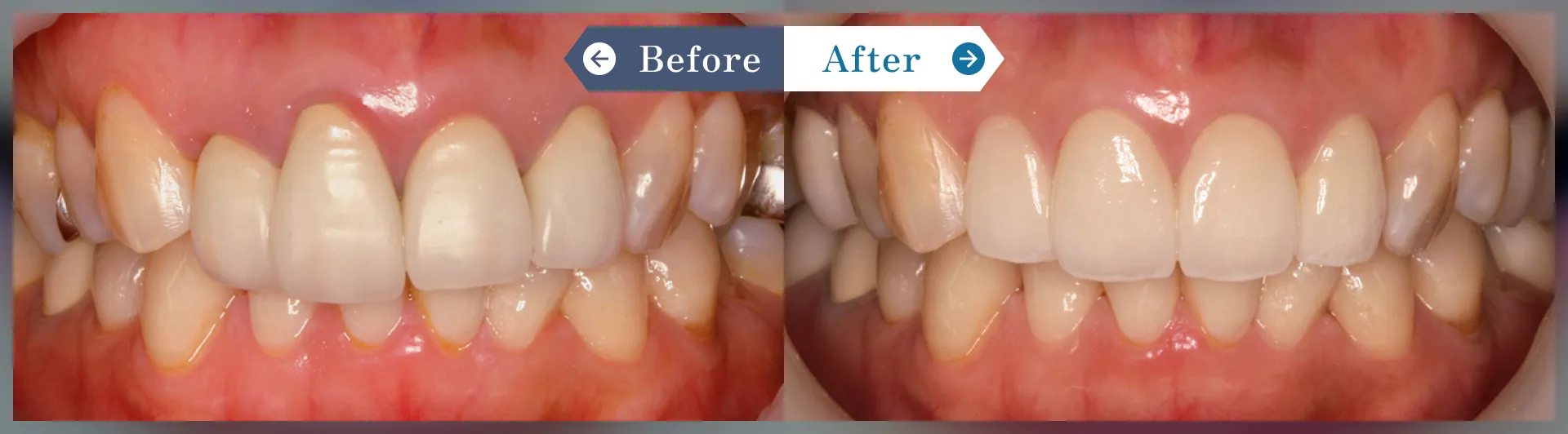 左上前歯3本のセラミックブリッジと上中央前歯2本を含む5本のラミネートベニアを行った症例です。左上Cの残存乳歯は抜歯し、全体の歯肉整形と合わせてセラミックブリッジを行ました。上中央前歯はすきっ歯と歯並びを改善するために削ってからラミネートベニアを行いました。