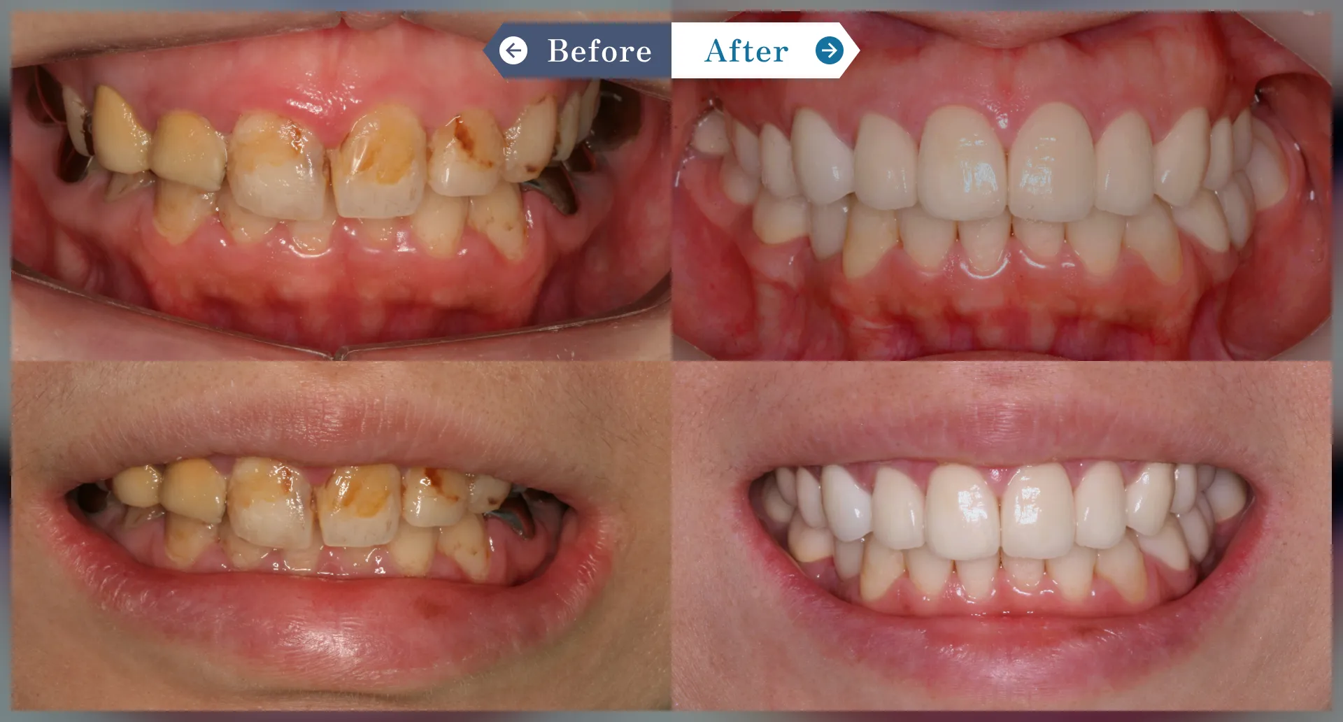 上前歯8本のセラミッククラウンの審美歯科と全体の虫歯治療、インプラント2本および咬合治療を行いました。審美歯科だけでなく虫歯や歯肉炎や咬合の治療も行っています。下前歯はクリーニングとホワイトニングのみでキレイにしました。