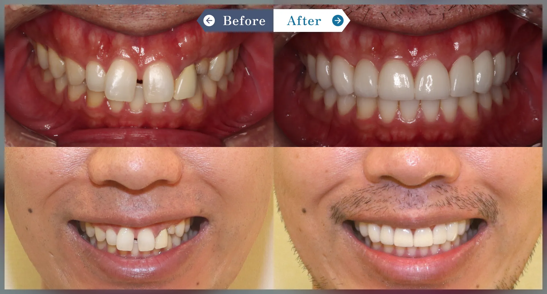 右上1は失活歯(神経のない歯)で変色し、上中央前歯2本がかなり前突していました。全体的にホワイトニングしてから、上中央前歯2本をセラミッククラウン改善しました。歯を小さくしたいとのことで2本のサイズも小さめにしました。歯並びを改善して自然な色と仕上がりに改善できました。