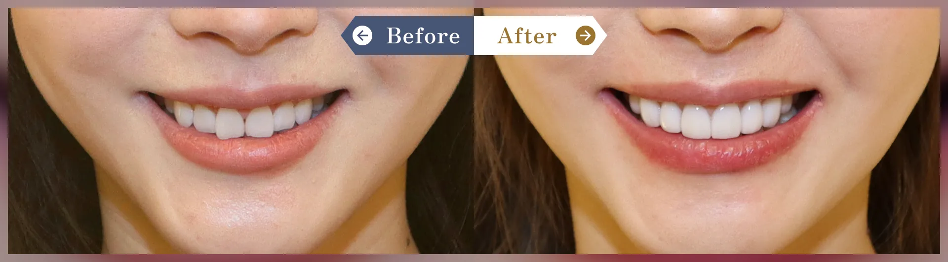 歯の色・歯の形を改善した症例です。ラミネートベニアは前歯をキレイに華やかにすることができます。明るい白のラミネートベニアで、スマイルラインに沿った自然な美しさへ。お口元の印象が整いました。