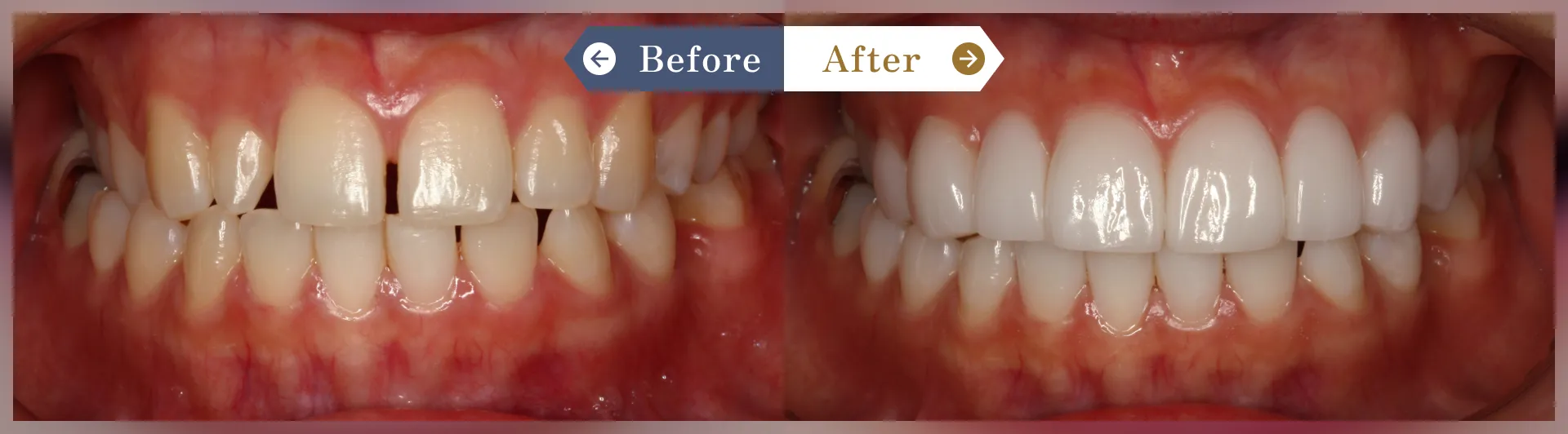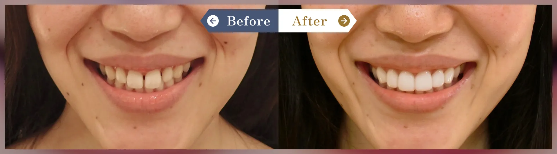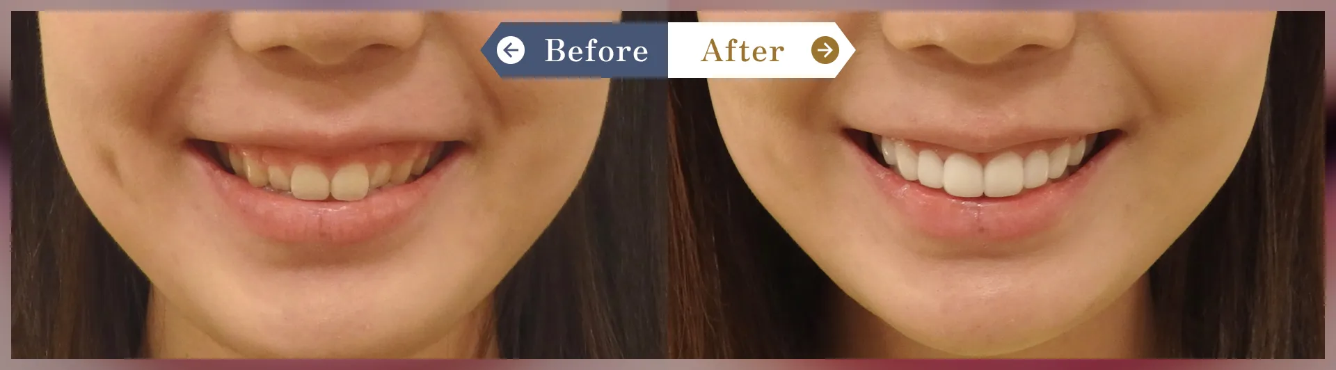 すきっ歯の改善は削らないラミネートベニアが最も得意とする症例の1つです。明るい白のラミネートベニアで歯の隙間を整え、スマイルラインに沿った自然な仕上がりになりました。